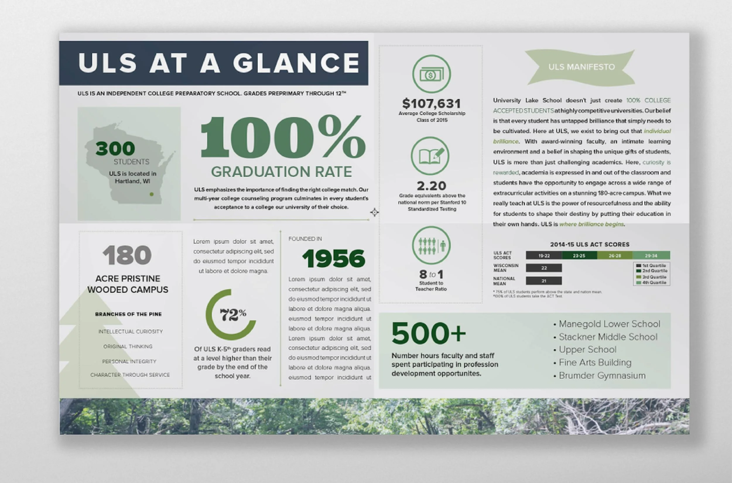 University Lake School needed a way to deliver a campaign for the 2015-2016 school year which truly spoke towards their students. "Where Brilliance Begins" embodies the culture, tradition, and academic pride ULS brings their students. Manifesto Agency created various marketing pieces including; Billboards, Viewbook, Postcards, Mailers, PSA Video, and much more to get this message across the Milwaukee area. I took lead on designing the Infographic to the right, as well as the Viewbook below